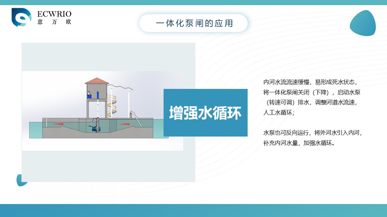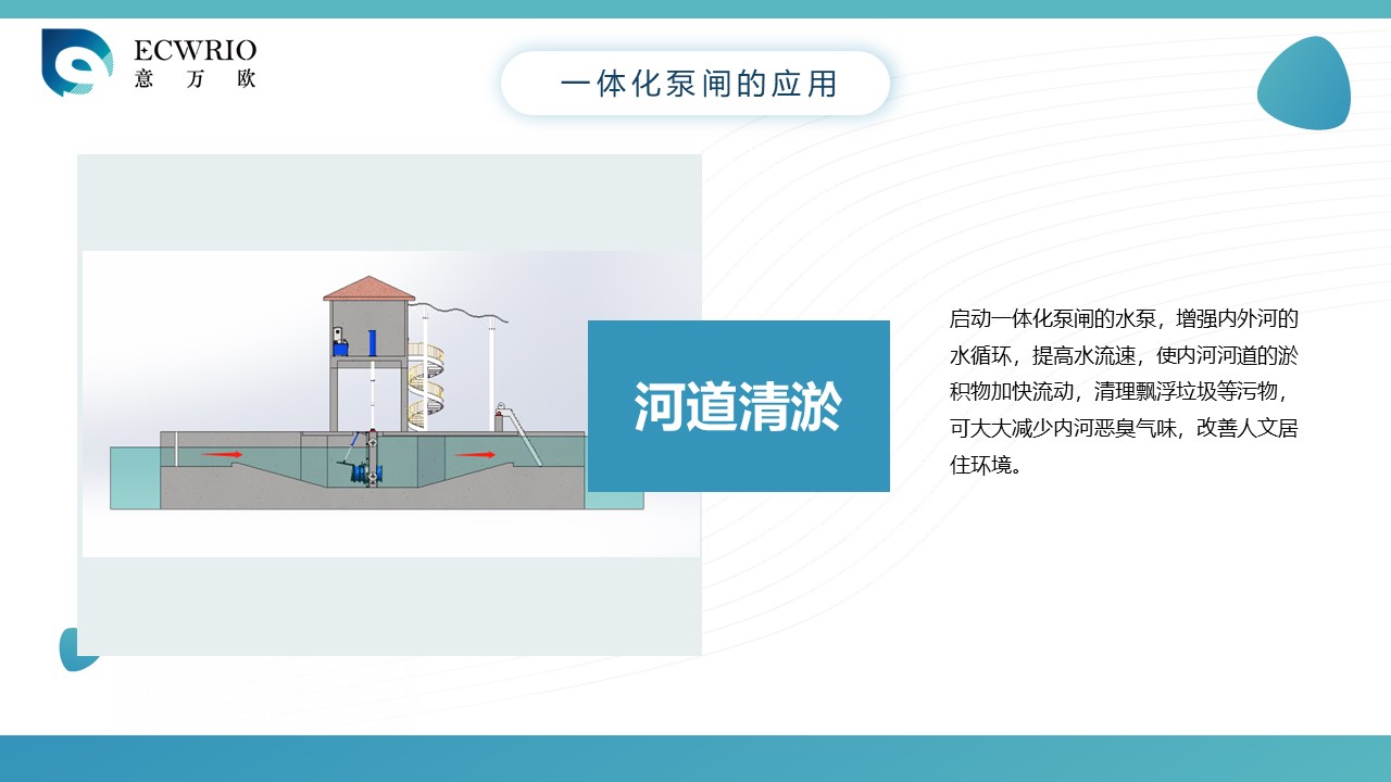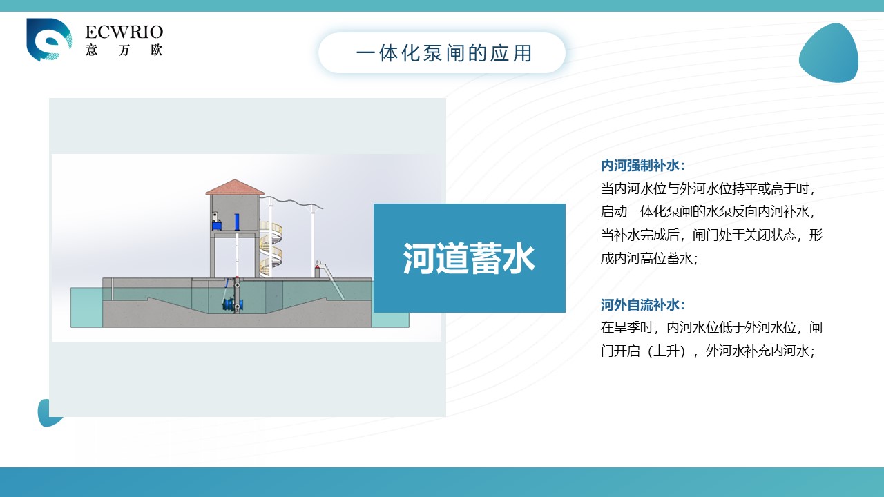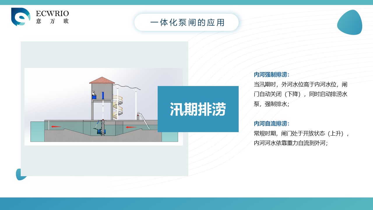一体化泵闸是一种将泵站和闸站一体式布置的泵闸,是根据我国城市的排水系统和水利工程系统现况,再结合多年泵站、闸站的实际设计应用经验而专门研发的集成式闸站,其主要用于城市河道的水调蓄,内外河水体交换和防洪排涝,一体化泵闸具有单向排水和双向排水功能,雨季时候城市排涝,旱季可以实现内河补水,通过加快水体交换实现内河黑臭水体快速的排放到外河上,一体化泵闸平时还可以景观蓄水,是水利设备中一种综合的多功能设备。