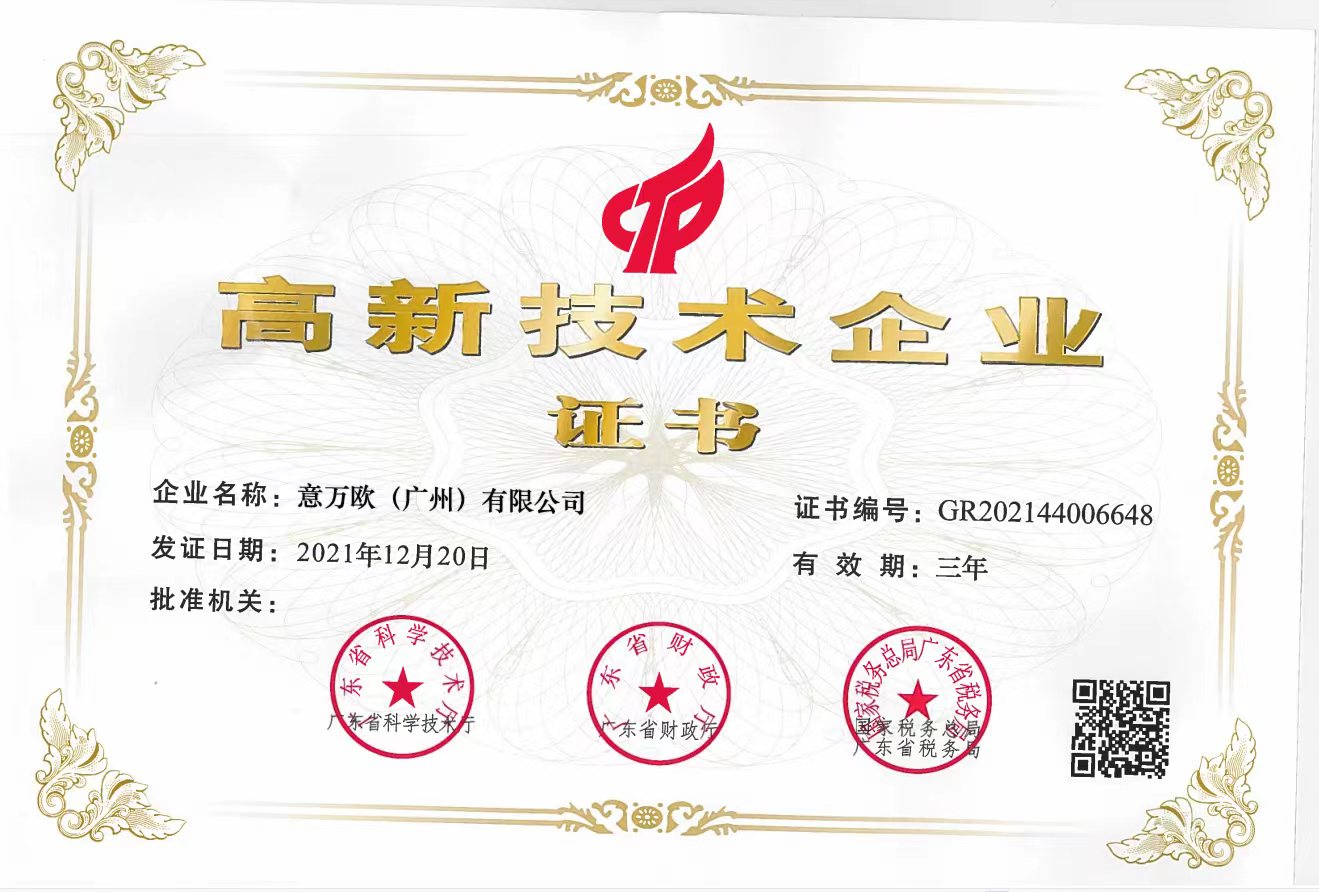 热烈祝贺意万欧(广州)有限公司通过高新技术企业认证